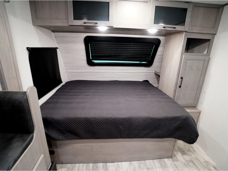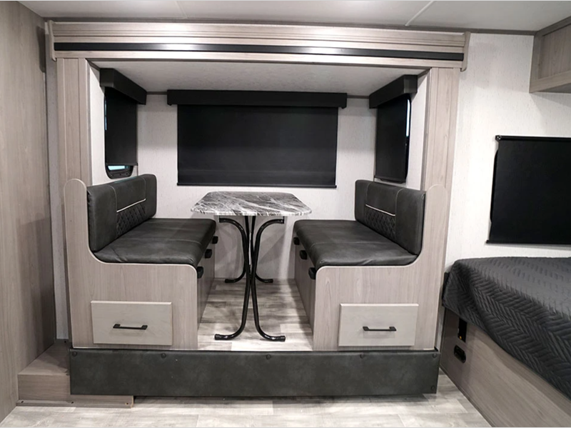 The hybrid aluminum steps give you stability as you enter and exit the unit and are easy to expand or store away when you are traveling. With a standard 13,500 BTU A/C unit, you will stay cool even on the hottest summer days, and the on-demand tankless water heater will provide endless hot showers. You will love the look of the seamless countertops and the Home Series interior collection decor, and there is HyperDeck flooring that is durable and easy to keep clean!
