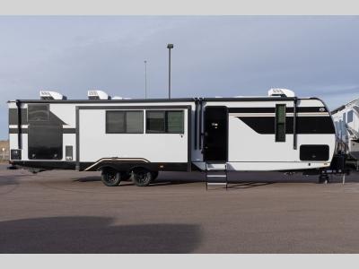 Sleeps 9 Slides 3 Length 39 ft 10 in Ext Width 8 ft Ext Height 11 ft 4 in Hitch Weight 1195 lbs Dry Weight 8933 lbs Cargo Capacity 2462 lbs Fresh Water Capacity 39 gals Grey Water Capacity 106 gals Black Water Capacity 30 gals Number Of Bunks 2 Available Beds Custom King, Versa Queen Refrigerator Type 12V Refrigerator Size 10.7 cu ft Cooktop Burners 3 Shower Size 36" x 30" Number of Awnings 1 Water Heater Type On Demand Tankless AC BTU 31500 btu TV Info LR TV Awning Info 20' w/LED Lights Axle Count 2 Washer/Dryer Available Yes Shower Type Standard Similar Travel Trailer Floorplans