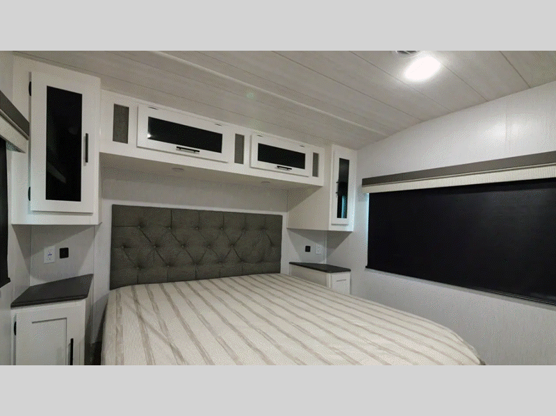 Sleeps 8 Slides 1 Length 33 ft 11 in Ext Width 8 ft 6 in Ext Height 13 ft 2 in Hitch Weight 1564 lbs Dry Weight 9564 lbs Cargo Capacity 2200 lbs Fresh Water Capacity 57 gals Grey Water Capacity 130 gals Black Water Capacity 45 gals Number Of Bunks 2 Available Beds Custom King with Versa-Tilt Refrigerator Type 12V Refrigerator Size 10 cu ft Convection Cooking Yes Cooktop Burners 3 Number of Awnings 1 LP Tank Capacity 30 lbs Water Heater Type Tankless AC BTU 15000 btu TV Info LR Smart TV Awning Info Power w/Adjustable Legs Axle Count 2 Number of LP Tanks 2 Shower Type Radius Electrical Service 50 amp Similar Floorplans